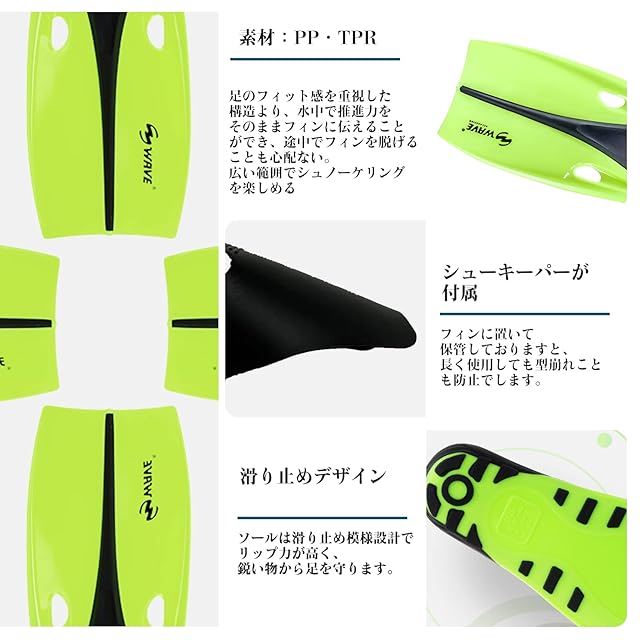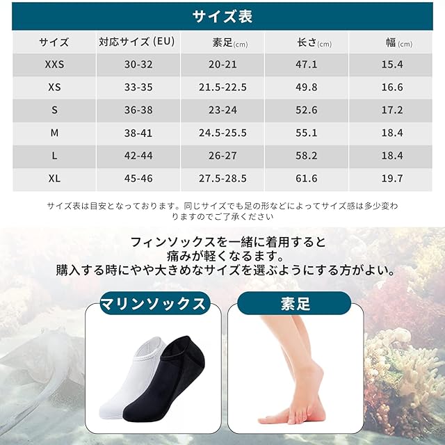 【厳選された素材】PPとTPRゴム素材で作られ、弾力性に優れ、足を動かした時にしっかりとした水流を作り出し、初心者でも海中を泳ぎやすいように仕上げます。柔軟性と耐久性を兼ね備え、変形しにくく、長時間着用しても快適にシュノーケルを満喫できます 【拘りのデザイン】かかと部分まで覆われたフルフットタイプのため、ストラップタイプより密着度が高く、フィンと足の一体感を実現し、快適なフィット感を与えてくれます。また、フットポケットの排水穴設計により、水の抵抗を軽減してくれます。さらに、流線型のデザインを採用し、足の力がフィンに伝わりやすく、水中の推進力をアップさせ ます 【快適な着心地】素足はもちろん、ビーチを歩く際の怪我を避けるため、ソックスと併用するのも可能です。また、短いブレードとエラストマーのフットポケットにより着脱しやすく、陸の移動が多い場面でも重宝します。さらに、ソールに滑り止め加工を施し、耐衝撃性を高め、岩場や砂浜での滑りや転倒を防げ、快適性と安全性を両立させます 【軽量でコンパクト・収納便利】軽量化設計とコンパクトなサイズのため、ブレードが短く、水中での小まわりが利き、軽やかな蹴り心地を実現しながら推進力にも繋がります。リュックサック、スーツケース、収納袋に入れて収納でき、旅行中に重宝するアイテムです 【豊かなバリエーション・喜ばれるギフト】バリエーション豊かな3色と3サイズを展開し、幅広い年齢層の方にご愛用いただけます。新年、クリスマス、記念日、就職、入学、卒業の日に、家族や友人への心温まるプレゼントとしてもおすすめです。ご注意:同じサイズでも足の形等により多少サイズ感は異なりますので、予めご了承ください