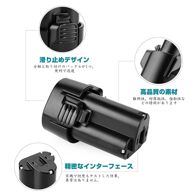 商品の仕様:型番:BL1013 マキタバッテリー10.8V 互換品 電圧:10.8V 容量:3.5Ah(3500mAh) ワット数:37.8W 種類:リチウムイオン電池 数量:2個