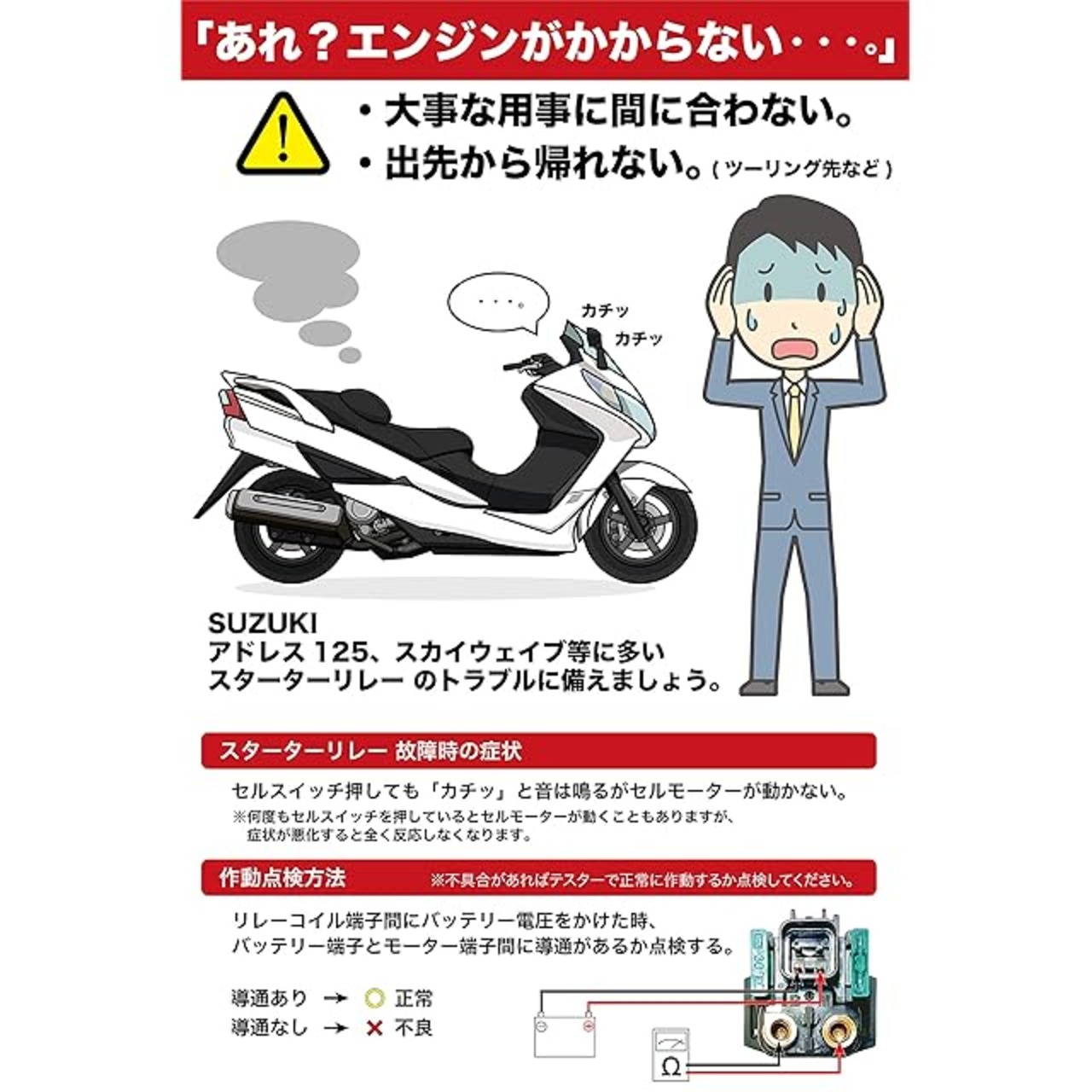 【スターターリレー故障時の症状】 セルスイッチを教えても「カチッ」と音は鳴るがセルモーターが動かない。初期は、時々症状が出現しますが悪化すると全く反応しなくなります。