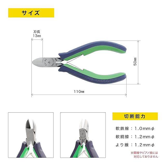 切断能力:軟鉄線/φ1.0mm、軟銅線/φ1.2mm、より線/φ1.2mm