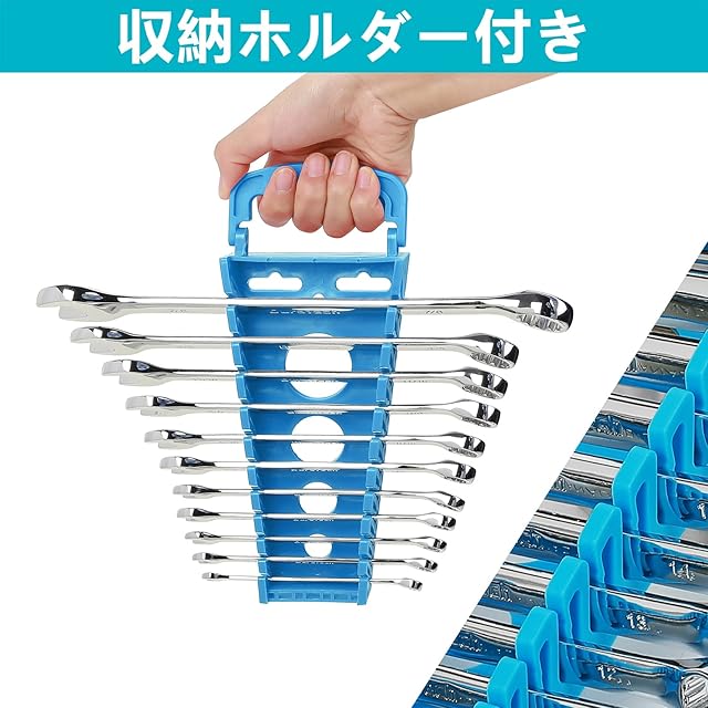 【収納ホルダー付き】レンチ類を長さごとに分類でき整理・整頓した状態で収納・保管が可能です。持ち運びや壁やペグボードの吊り下げに非常に便利です。また、使用する際には、識別しやすいので取り出しにも便利です