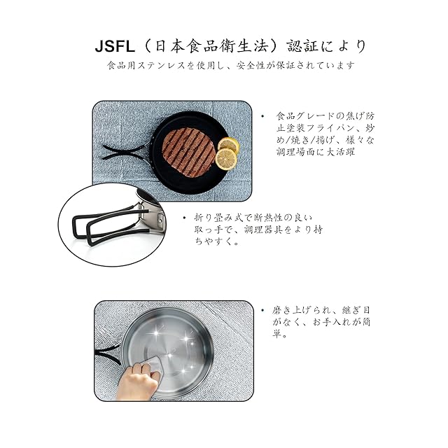 【調理や洗浄がもっと簡単に】フライパンはこびりつきにくいコーティング加工を施しています。生産工程が一つ増えますが、調理やその後の洗浄がもっと簡単になるようにしています。鍋には伸線研磨処理が施されていて、さらに洗いやすく、簡単に拭くだけで汚れが落ちます。またこの製品はJSFL(日本食品衛生法)認証を取得していて、食品レベルの素材なので安心してご使用いただけます。