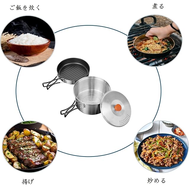 【厳選した高品質なステンレス】アルミ合金と比べてコストは高いですが、丈夫で耐用性が高いステンレスを使用しています。旅行中何かにぶつけても、ステンレスはアルミ合金よりも、衝撃で変形しにくくなっています。またクッカーは熱が均一に伝わり、アウトドア用カセットコンロや電磁調理器など様々なコンロに対応しています。