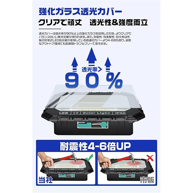 【耐久性抜群のIP66防水&強化ガラスカバー採用】 屋外でも安心して使えるIP66防塵防水設計。さらに、98%以上の透光率を誇る強化ガラスカバーで、発光のクリアさと耐衝撃性を両立。通常のプラスチックカバーより4〜6倍の強度で、悪天候や衝撃にも耐えられる設計です。