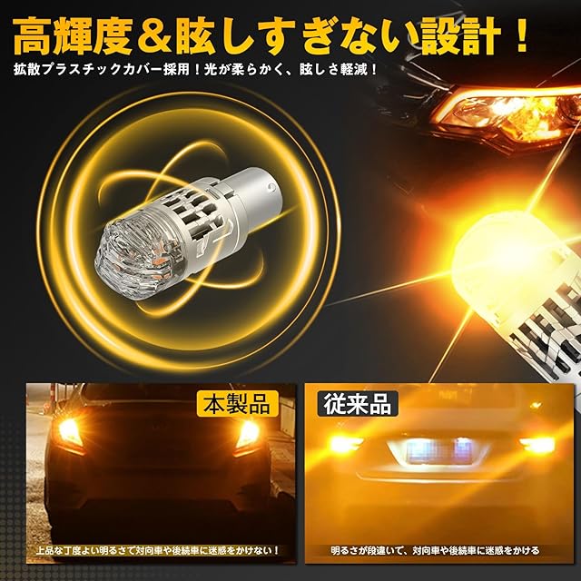 【無極性・簡単取付】こちらのs25 ピン角違い led ウインカーバルブは無極性で、純正球と簡単に交換でき、差し込むだけで取り付け完了。ハイフラ防止抵抗が内蔵されており、抵抗器の取り付けやリレーの交換は不要。従来品より短く、取り付けの心配はありません。車種を問わず、狭いスペースにも対応可能です。