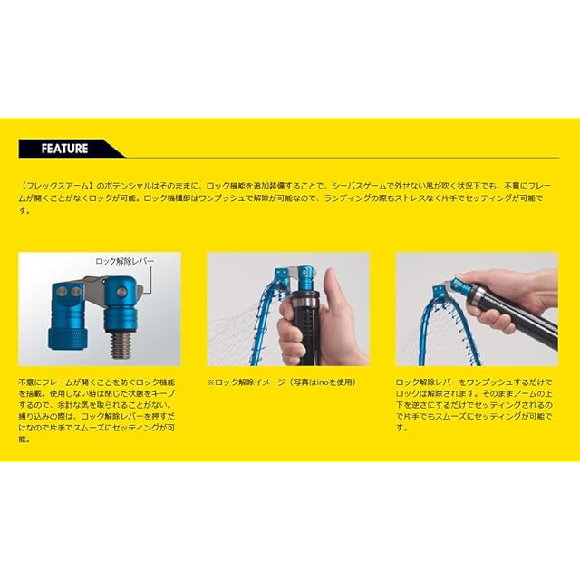 手首を返すだけで、片手で玉網が素早く水平に振り出せ、取り込みの一連の動作がスムースにおこなえる『フレックスアームver,II』は、携帯時のフレームのバタツキを軽減する機能付き。