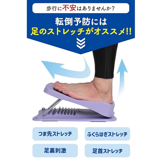 【転倒予防にオススメ!のびのびストレッチボード】高齢者や障がい者、大人から子ども・アスリートまで、幅広い方々の下肢トレーニングをサポート!これ1台でアキレス腱、ふくらはぎ、裏もも、おしり、腰、背中など身体の背面の部位をしっかり伸ばすことが可能です。前屈・屈伸・つま先上げの背屈など、体位変化により様々な使い方もできますよ♪【ストレッチの専門家が監修!】デイサービスでもよく使われている、ストレッチの専門家もオススメの健康器具。お好みの傾斜に調整して、ボードの上に乗るだけだから、どなたでも簡単にお使いいただけます。9段階で角度調節が可能なので、下肢の緊張度や柔軟性に合わせて無理なくストレッチOK。ご自宅はもちろん、オフィス、デイケア、スポーツクラブなど様々な場所で使用できます。【滑り止めで安心&安全】滑り止めパットを同梱していますので、画像のように裏面の四隅に貼り付けてください。使用中もズレにくく安心です。 【丸洗い可能で衛生的】丸ごと水洗いできるので清潔に使用できます。 【軽量&コンパクト】軽量で持ち運びしやすく、折りたためて場所も取りません。使用していないときはソファやベッド下などに収納しておくと便利ですよ。【快適&安全な設計】耐衝撃性が高いABS素材を採用した丈夫なつくり。表面の凹凸フォームパッドで足裏が滑りにくいです。また、カカトを保護するクッションを同梱していますので、カカト当ての部分に貼り付けてください。カカトが痛くならないよう工夫しています。【メーカー90日】お客様に安心してお使いいただけるよう、商品到着後90日以内に限り品質サポートをご用意しております。初期不良等の不具合がありましたら、しっかり対応いたしますので、サポートまでご連絡ください。