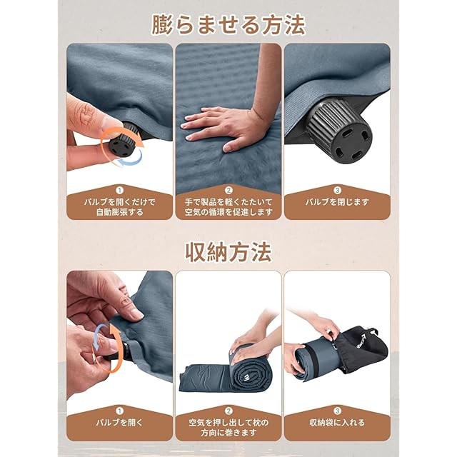 【高弾性スポンジ・自動膨張】このエアーマットは真ん中に高弾性スポンジを充填して、上部のバルブを開けるだけで約2~3分で自動的に膨らむため、簡単に設置できます。【ご注意】商品は真空圧縮してするため、初めて使用する前に、エアーマットを喚起するには以下の手順に従ってください。方法一:1.バルブを開けて、空気が入っていない場合、口で数回息を吹きかけてマットを膨らませる。2.空気を多く含む領域を空気のない領域に押し出し、空気がマット全体により均一に分布することを確保する。3. 2-3回往復した後、パルブを開けて空気を入れる。後の使用はバルブを開けて空気を入れできる。方法二:1.バルブを開けて、空気が入っていない場合、エアーポンプでマットを膨らませる。2. 五分間静止してエアーマットを喚起する。後の使用はバルブを開けて空気を入れできる。