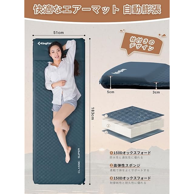 商品名:KingCamp エアーマット 自動膨張 インフレーターマット 枕一体式 軽量1.2kg 持ち運び便利 耐水加工 コンパクト キャンプ 車中泊 エアーベッド お昼寝 防災用 収納袋付き
