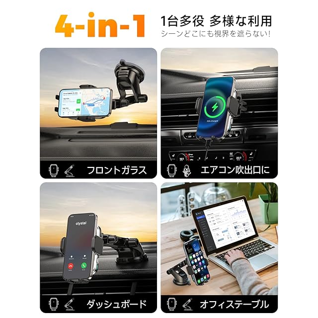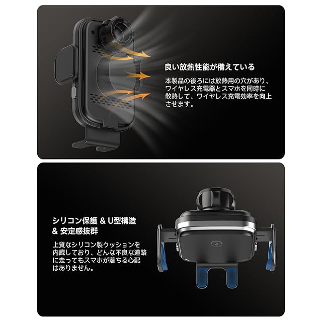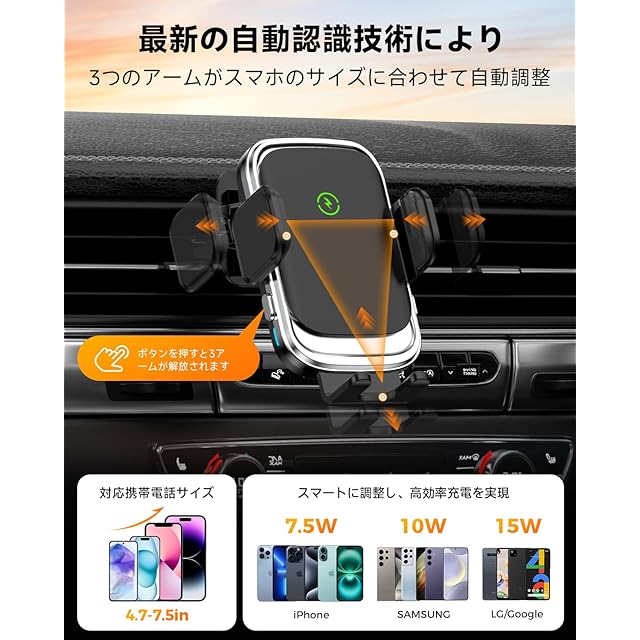【ワイヤレス充電器の進化モデル・さらに使いやすく】 ① 最新の自動認識技術と進化型インテリジェント誘導コイルを搭載:左右のクランプアームと下アームがスマートフォンを自動で挟み込み、3軸リンクシステムによりスマートフォンのサイズに応じて自動で位置を調整します。これにより、充電コイルの精密な位置合わせが可能となり、従来の車載充電器と比べて充電効率が20%向上。より速く、安全な充電が実現しました。 ② 内蔵スマートチップ,蓄電機能付き:エンジンが停止しても、4〜6回自動開閉が可能です。 ③ 押しやすい按圧式ボタンで誤操作を防止:しっかりとした押し心地により、意図しない軽い触れただけの操作を防ぎ、確実な操作が可能です。 ④ LEDランプによる充電状況の通知:電源オン、充電中、満充電、異物検知、過熱保護など、さまざまな状態をLEDランプで一目で確認できます。 ⑤ 強力なゲルと真空設計の吸盤で、耐荷重は25kg以上。吸盤が汚れて吸着力が弱くなった際は、ぬるま湯で洗い乾かすことで吸着力が復活し、繰り返し使用可能です。