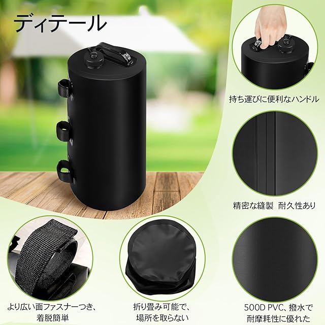 『20kg注水式テント重り』商品仕様:容量:20L(20kg) サイズ:直径:24cm 高さ:45cm 重さ:370g/個(4個セット) ポール適用サイズ:直径約15mm~55mm 備考:防水仕様、取手付き、面ファスナー4点付き このテント重りは、高品質な防水材質PVCクリップメッシュ素材を使用しており、耐久性が高く、日光にさらされても劣化しにくいため、長期間にわたり使用することができます。強風時の補強としても役に立ちます