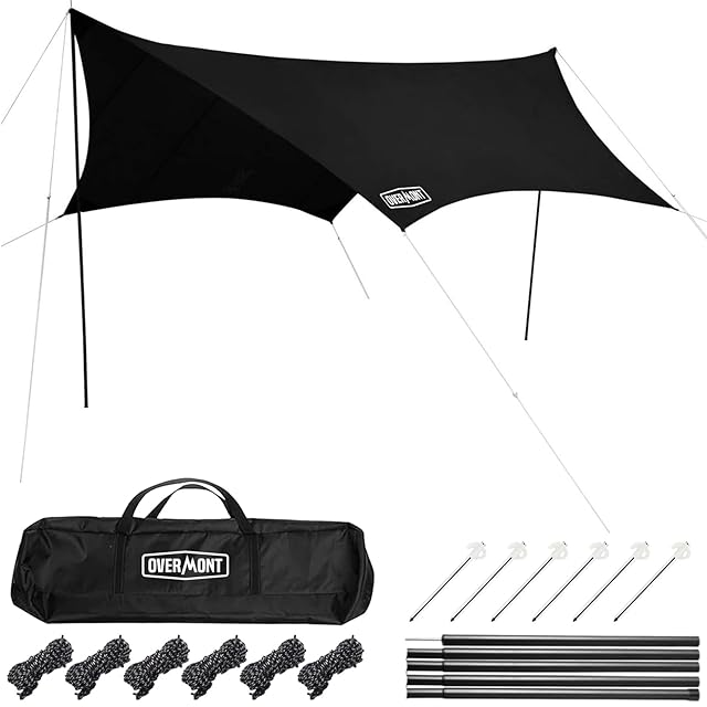 Overmont 防水タープ [5mx5m ポール付き 夜光ペグ 3-8人用] ヘキサタープ テント 天幕 シェード アウトドア 大型 難燃 焚き火可 テントとの取り組み可能 UV加工済 遮熱 遮光 キャンプ 収納ケース付