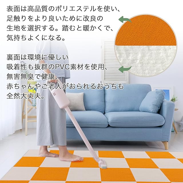 1、【毛玉出にくい、高品質マット】表面は高品質のポリエステルを使い、足触りをより良いために改良の生地を選択する。踏むと暖かくで、気持ちよくになる。裏面は環境に優しい吸着性も抜群のPVC素材を使用、無害無臭で健康、赤ちゃんやご老人がおられるおうちも全然大丈夫。しかも簡単に外せる、何度でも敷き直し可能のマットです。
