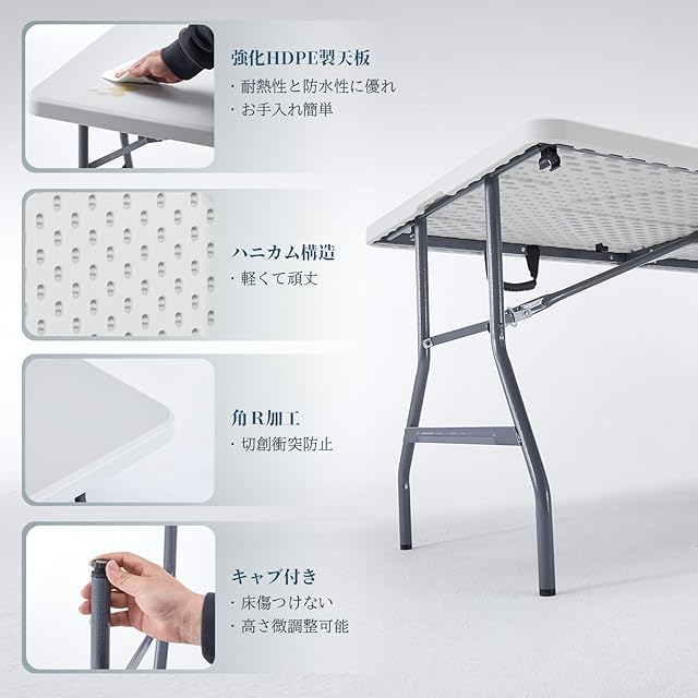 天板は強化プラスチック製で、丈夫で軽く、お手入れも簡単です。防汚機能もしっかり!持ち運びに便利な持ち手付。折り畳み式のデザイン、使用していないときでも持ち運びやクローゼットに簡単に保管できます。アウトドアにも最適で、折りたためば車の後部座席やトランクにも収納できます。1台有ると便利な折りたたみ式の作業テーブル! 日曜大工や園芸の作業台に!農作業や内職の作業台に!キャンプやバーベキューのアウトドアテーブルに!お好みや用途に合わせて使い分けることができる嬉しい仕様♪キャンプ、バーベキュー、お花見などにとても便利!