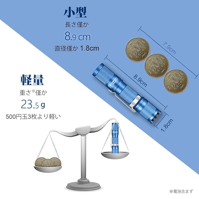 【超小型超軽量・五段階調光】航空機用アルミニウム合金を用いられた本体は、手のひらに収まれる8.9cm*1.85cmというコンパクトサイズになります。僅か23グラムの重量(電池含まず)では、500円玉3枚よりも軽く、片手で簡単に操作でき、携帯時にご負担になりません。5段階のライトモード(ターボ /高/中/ 低/ストロボ )機能を搭載しています。点灯モードはモードメモリ機能を搭載、常に使用する明るさから点灯できます。夜釣り・山登り・夜道の一人歩き・防犯・護身用・緊急災害時など様々なシーンに心強い味方です。