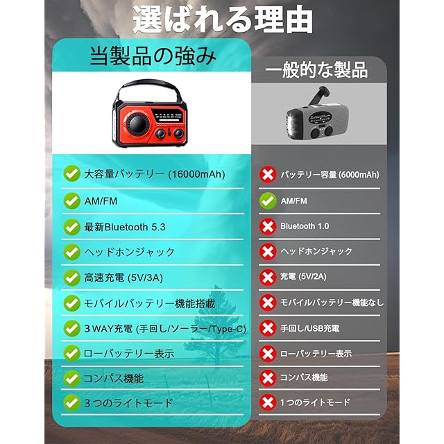 【もしもの備えに!大容量16000mAhバッテリー搭載の多機能防災ラジオ】 「もう電池切れの心配は不要!」この防災ラジオは、驚きの16000mAhという大容量バッテリーを内蔵。長時間の使用を可能にし、アウトドアや災害時でも安心して情報収集やスマホ充電ができます。さらに、日本のPSE認証も取得済みで、安全性もバッチリ。過充電や過熱を防ぎ、安全にご利用いただけます。まさに、非常用ラジオとして、防災グッズとして、心強い味方です。