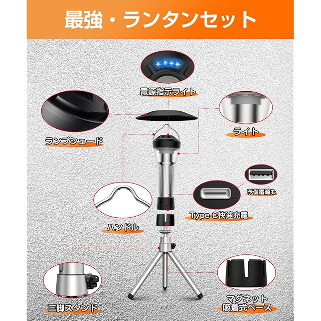 【落としても壊れない・しっかりした金属三脚】ランタンの本体は実験室環境下で複数回の落下テストをクリアしており、アウトドアでうっかり落とすなどの場合でも、簡単に破損することはありません。アルミ合金製の三脚は高級感があり、プラスチック製よりも耐久性が高く、屋外の悪天候にも対応し、錆びにくい特性があります。また、転倒 の心配もない安定性があります。キャンプ場でバーベキューしているときにこんなランタンを横に置くと、雰囲気がいっぱいになります!