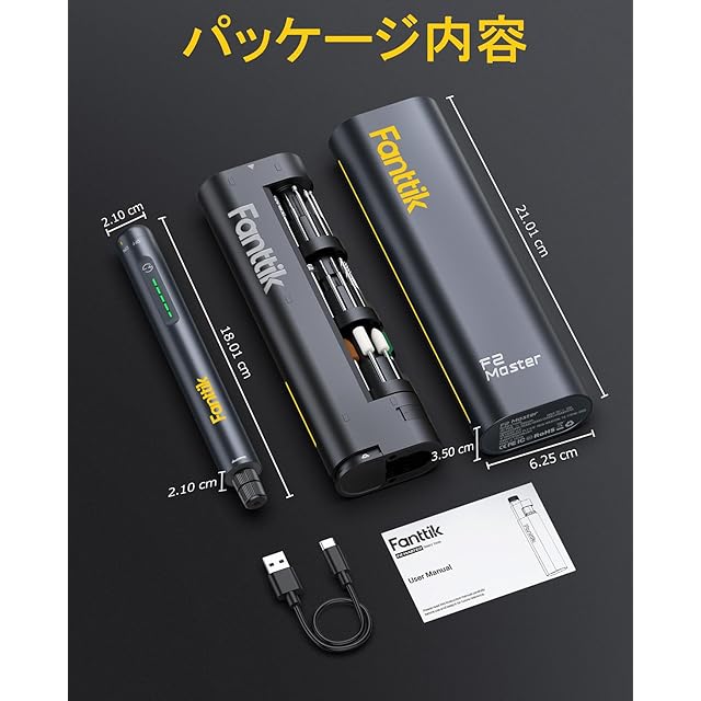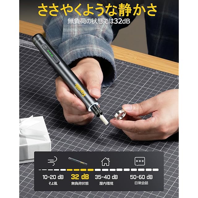 Fanttik F2 Master ミニルーター 5段変速 25000RPM高速回転 コードレス 4V USB-C 充電式 マグネット回転ハブ 35個付属品 環状LEDライト コンパクト 軽量 彫刻 穴あけ 研磨 切断 切削 つや出し 汚れ落とし DIY工具 ささやくような静かさ: Fanttik F2 Master ミニルーターはブラシレスの中空カップモーターを搭載しており、普通モーターに比べてノイズが30%低減されます。回転速度は25,000 RPMに達し、もっと強力なパフォーマンスまたもっと少ない熱を実現します。5段可変速度設定により、さまざまな精密作業を簡単に対応できます 回転式マグネットハブ: もう乱雑なアタッチメントを探す必要はありません!ミニルーターF2 Master は360°回転できるマグネット式スタンドと整然と並んだ35個アクセサリー(3/32インチ/2.3 mm)を備えており、研磨、研削、穴あけ、彫刻などのDIY作業をもっと簡単にまた便利にします ミニで携帯式: 重さはわずか100グラムの軽量設計で、いつでもどこでもの創造性に適用です。高級感があった丈夫なアルミケースは錆びにくく、ワンクリックで飛び出すデザインの開け方で、道具に素早く簡単にアクセスできます お洒落でまた実用的: シームレスの一体型速度調整ボタンは防水性と防塵性に優れ、お手入れも簡単で、汚い作業環境でも楽々に対応できます。革新的なLED速度表示灯は、精確な操作を行うためのリアルタイム設定を表示します USB-C 充電: ユニバーサルなType-C式差込口は1時間で完全に充電できます。ミニルーター尾のバッテリー残量表示灯は電量が30%未満となると赤に変わり、すぐ充電の必要を提示します。先端のLEDライトは明るいDIY作業場をサポートします