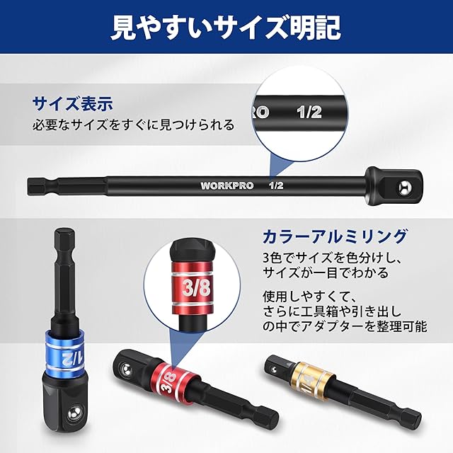 【豊富なセット内容】WORKPRO ソケットアダプター9本組です。ソケットアダプター【カラーアルミリング型】*3PC:差込角 6.35mm・9.5mm・12.7mm各1本(全長65mm&65mm&72mm)、ソケットアダプター*3PC【長型】:差込角 6.35mm・9.5mm・12.7mm 各1本(全長150mm)、ソケットアダプター*3PC【ユニバーサル型360°回転】:差込角 6.35mm・9.5mm・12.7mm 各1本(全長55mm&55mm&59mm)。適用:6.35mmの六角軸シャンク。