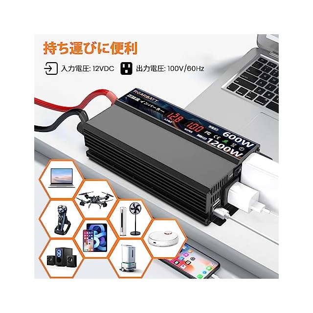 【12V 600W インバーター 純正弦波】 ROARBATT インバーター 12v 100v 正弦波 600W 入力電圧:DC12V(10V-16V) 出力電圧:AC100V±5% 定格出力:600W 瞬間最大出力:1200W 出力周波数:60Hz ≥ 90%変換効率でバッテリーの損失を減らし、バッテリーの使用寿命を延ばし、インバーターをより楽しく使用します。
