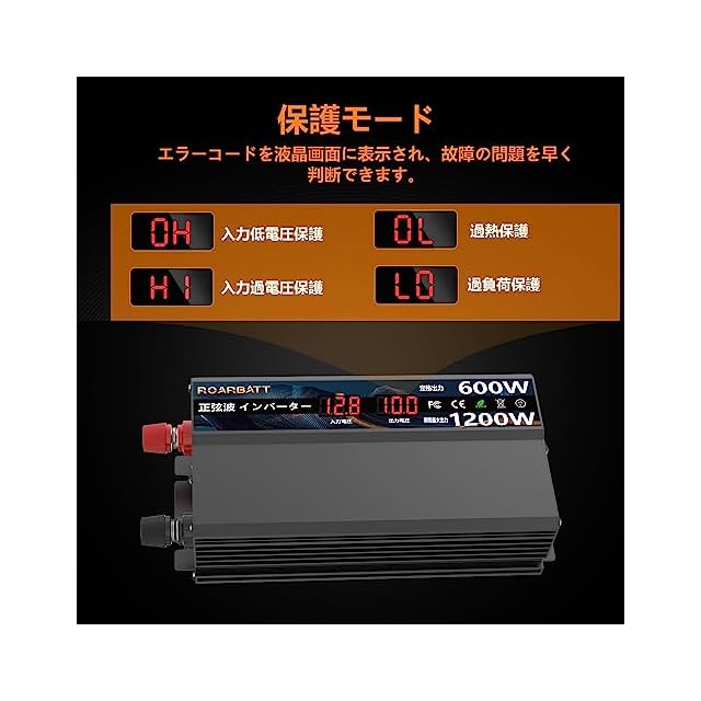 【LED液晶画面表示付き、保護機能搭載はより安全!】12V600W 正弦波インバーター 晴れた日でも夜の暗い道路でも、はっきりと見えるようになっています。入力低電圧警報音、入力低電圧遮断、過温度遮断、出力過負荷遮断、 短絡遮断、入力過電圧保護、6つの保護装置が装備されております。 【LO】入力低電圧保護 、エラーコード【HI】入力過電圧保護 、エラーコード【OL】出力過負荷保護 、エラーコード【OH】過温度保護 故障コード表示により、お客様の故障診断が迅速に行うことができます。