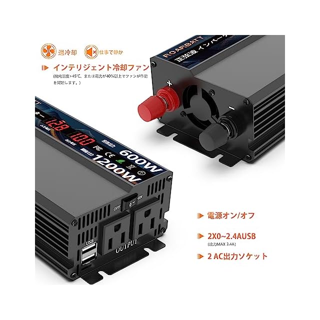 商品名:ROARBATT インバーター 正弦波 12v 100v 600W 純正弦波 瞬間出力1200W DC12V(直流)をAC100V(交流)に変換 カーインバーター 2.4AUSB MAX3.4A ポート、ACコンセント電源2口 家庭緊急用電源 車中泊グッズ アウトドア 自動車 キャンピングカー用品
