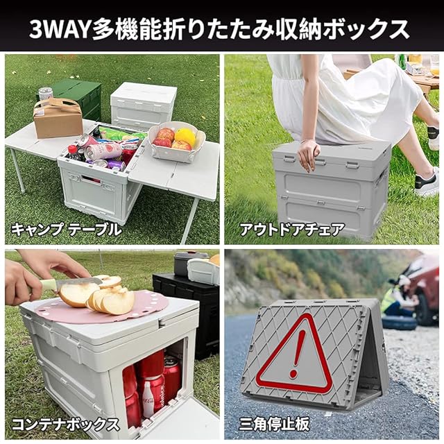 【3way 折り畳み 収納ボックス】収納箱界の大革新!この収納ケースには、キャンプ テーブル、収納ボックス、三角表示板の3つの形態があります。ボックスを完全に展開し、付属のPVC脚 6 本を取り付けると、キャンプ テーブルが手に入ります。78×33cmの天板はソロキャンプのあらゆるニーズを満たします。真ん中の天板は両面使用でき、滑り止めの付いた片面にはカップ、ボウル、箸などを置けます。もう一面がフラットな天板で、小さな操作台を持つことができます。天板と2つの側面はすべて開くことができ、ボックスを積み重ねる状態にも楽に物を取り出して、伝統的な収納ボックスに比べてもっと便利で、機能性が向上します。お部屋でもキャンプでもこれひとつで、不思議と様になります。