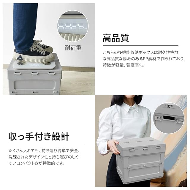 【高品质&強い耐荷重】こちらの多機能収納ボックスは耐久性抜群な高品質な厚みのあるPP素材で作られており、軽量で強度が高い。ボックスの両端にはたくさん入れてもしっかり運べる取っ手があるので、持ち運びに便利。洗練されたデザイン性と持ち運びのしやすいコンパクトさが特徴的です。側面扉から開けて物を取りやすい、時間もかかりません。天板を閉じれば、椅子としても利用でき、耐荷重は50kgです。