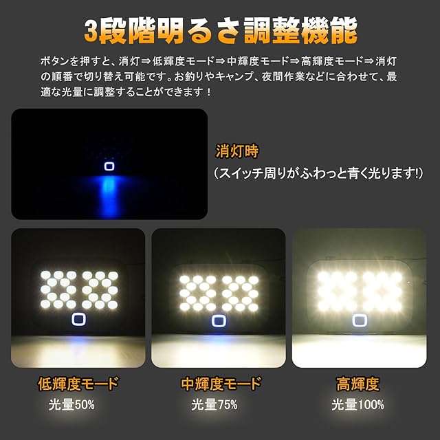 【高輝度&明るさ調整可能】本ラゲッジランプは、超高輝度のLEDチップが搭載し、広範囲を明るく照らし、荷室オープン時の夜間視認性を大幅に向上します!または3段階明るさ機能付き、ボタンを一回押すと明るさが調節可能です。お釣りやキャンプ、夜間作業などに合わせて、簡単に最適な光量に調節することができます。