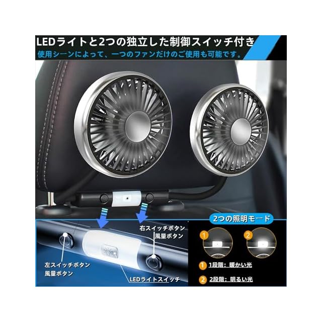 【個別スイッチ仕様】車 扇風機 車用扇風機 USB 扇風機 双頭車載ファン 後部座席の使用 扇風機 LEDライト付き 3階段風量調節 低騒音 5枚羽根 車用ファン 360°角度調節可能 約180CM USB延長コード 空気循環 蒸れ解消 取付簡単 夏対策 車中泊対策 カー用品