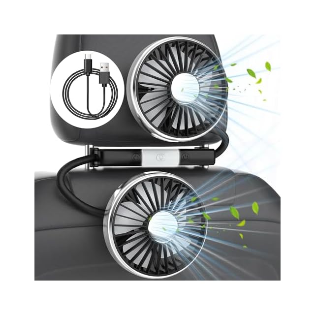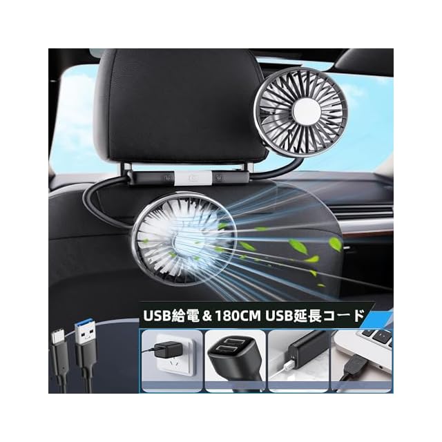 【360°角度調整】車のファンの両側部分はシリコンホースで作られているため、自由に曲げることができます。角度は手動で360°調整可能、清新なそよ風が後部座席や後部座席の隅々まで吹くことを確保します。運転中に乗客、ペット、子供を快適にするのに最適です。夏日の暑い車内対策、夏の旅行やお出かけに便利! (ご注文前に設置場所のサイズ・形状をご確認ください。 ※ヘッドレスト一体型シート等の特殊形状シートには非対応です。 ※ヘッドレストの距離10cm〜14cmに適しています。