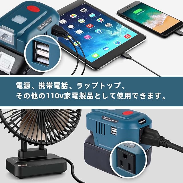 【様々な用途で活躍、災害時にも安心!】YMWLKJマキタバッテリーインバーターは地震、キャンプ、車中泊、旅行、夜釣り、緊急時などの電源として、スマホ、タブレット、カメラ、望遠鏡、扇風機、ライト、ノートパソコン、電気毛布へ供給するために利用出来る万能な小型発電機です。YMWLKJマキタバッテリーインバーターは樹脂製のため耐衝撃でとても頑丈にできて、大容量リチウムイオン電池を搭載することにより小型ながら出力容量が大きく、重量250gと持ち運びが容易です。災害時に坂道や階段を人力で運ぶ場合や停電などでエレベータ等が使えなくなった場合でも持ち運びが楽にできます。
