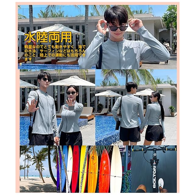 【水着セット内容】長袖ラッシュガード+サーフパンツ。最適の機能性前開きラッシュガードパーカー、吸汗速乾通気のドライ繊維、激しい運動の後もさらっとした着心地!サーフパンツはメッシュインナー付き、長時間履いても蒸れず、快適にご着用いただけます。