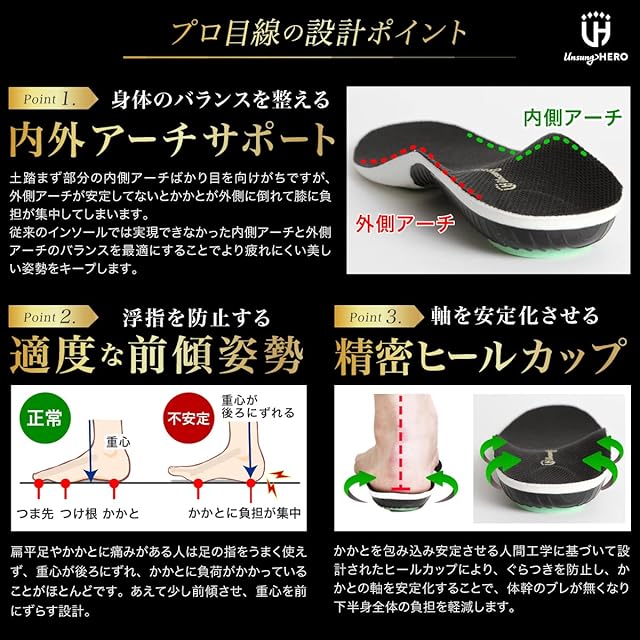 商品名:【柔道整復師 監修】足の負担軽減インソール 中敷き インソール 美姿勢キープ アーチサポート 衝撃吸収 ヒールカップ UnsungHERO (S:22〜24cm)