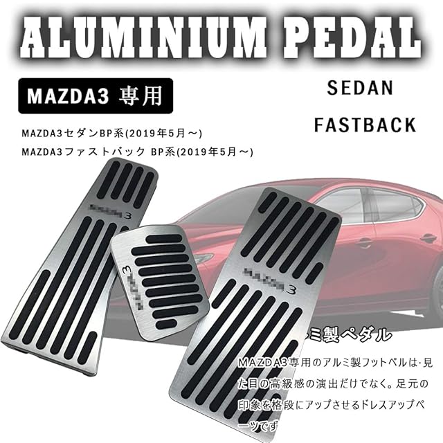 【商品説明】<br> MAZDA3セダン/ファストバック BP系用 アルミペダル<br><br> 本製品は純正カバーを外して付け替えるだけの簡単取付。<br> 穴開け作業は不要です。<br> ●純正部品と同じサイズで、アクセルペダルは、純正ペダルの上にそのまま被せます。<br><br> ●素材はアルミ素材を採用、グリッド部分にラバーソールを挟むことで、操作性もデザイン性も向上しています。 <br><br> ●デザイン性だけでなく、ラバーソールで滑り止めを施し、確かな運転性を向上させています。 <br><br> ●ドアーをあけて、乗り込む時足元の雰囲気が最高です。<br><br> 仕様(スペック)<br> 材質: アルミ製 滑り止めゴム付き<br> カラー: ヘアライン仕上げ × ブラック<br> セット内容: アクセルペダル 、 ブレーキペダル、フットレストペダル<br> ■適合車種■<br> MAZDA3セダン BP系(2019年5月~)<br> MAZDA3ファストバック BP系(2019年5月~)<br><br> 【セット内容】<br> ブレーキペダルカバー*1 <br> アクセルペダルカバー*1<br> フットレストカバー*1 <br> 日本語説明書*1<br><br> 【取り付け方法】<br> ブレーキペダルカバー:ブレーキペダルは既存のペダルを外しはめ込んでいきます。タイトルに書いたように暖めてから着けると割とスムーズに作業出来ました。<br> アクセルペダルカバー:アクセルペダルは上からはめていくタイプ。<br> フットレストカバー:裏面に両面テープが付いています。 <br><br>