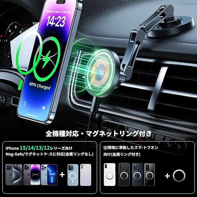 【Mag-safe対応スマホホルダー &ほぼ全機種対応】iPhone16/15/14/13/12シリーズやMag-safe対応ケースを装着しているスマホは直接使えます。その他の場合は、付属の金属リングシールを貼り付けて使う必要があります。金属リングシールを貼り付けままでもワイヤレス充電やマグネット充電器に対応できます。粘着力をより安定するために、取り付け後、ホルダーをご使用の前に24時間をお待ちください。iPhone 11/X/SE/Xperia/Galaxy/Huawei/Google Pixelなど4.3-7.6インチスマホは付属品のメタルリングを貼ればほぼ全体機種に対応できます。( ご注意: ご購入前にお使いの機器がワイヤレス充電対応機種かどうかご確認ください。)