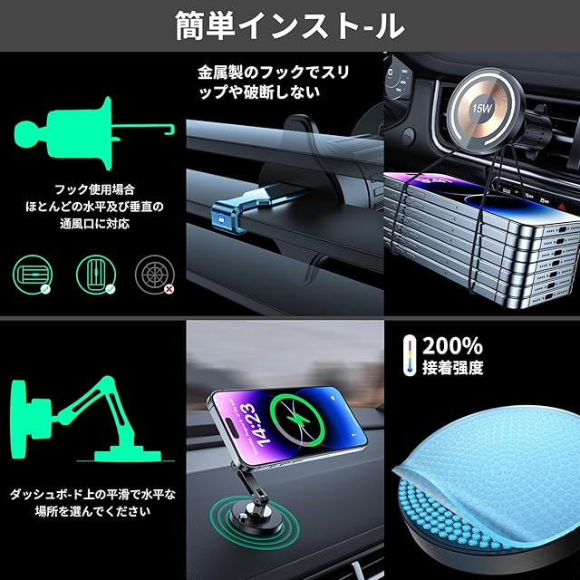 【2in1ワイヤレス車載充電器&車載ホルダー】当社のスマホホルダーには、フックも付属しており、ダッシュボードと車のガラスや吹き出し口など、運転のクセに合わせて使い分けができます。車載iPhoneホルダーとしてだけでなく、Mag-Safeワイヤレス充電器としても使用できます。最大15wの急速充電をサポートします。昔の並び方を改良し、N52マグネットを16個内蔵し、耐荷重とホールド力が第一世代から30%アップいたしました。磁力が強化されたことで、使用中の落下や揺れがなくなりました。運転中の急ブレーキや、デコボコした道などどんな激しい悪路でも、スマートフォンが落ちる心配はありません。安定な磁力場を保ちながら、信号障害にもならずにスムーズな通信ができます。(ご注意:安価で販売している出品者がありますが、弊社の商品ではありませんので、ご注意ください。弊社(aikede)以外の正規代理店は存在いたしません。 購入の際はご注意ください。)