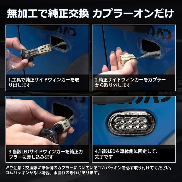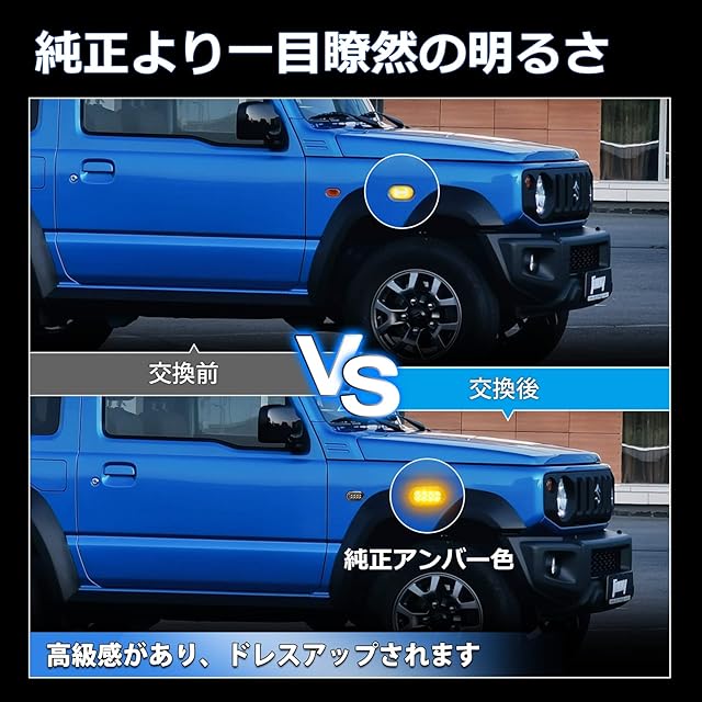 製品情報:車種別専用LEDサイドマーカー ウィンカーランプ「適合車種」:スズキ 新型 ジムニーJB64 /ジムニーシエラ JB74、年式: H30.7~「発光色」:純正アンバー色「セット内容」:ハイフラ抵抗内蔵LEDサイドマーカーランプ×2、お買い上げ日から1年間の保 証付き。
