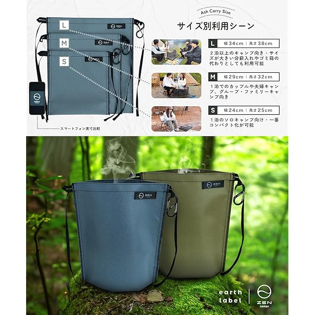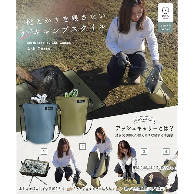 商品名:ZEN Camps 火消し袋 アッシュキャリー アースカラー 炭処理袋 炭消し袋 炭袋 防水 自立 Ash Carry キャンプ 耐熱性 難燃性 コンパクト 大容量 (S(25*24cm)グリーン)