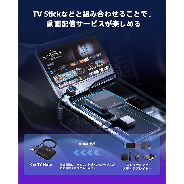 【簡単取付】CarPlay対応のカーナビのUSBポートに製品のUSBプラグを差し込んだ後、HDMI出力デバイスを製品のHDMIポートに接続すれば取付完了!ファイヤーtvスティックなどのストリーミングメディアプレイヤー、DVD、ゲーム機等を車内で楽しむことができます。※HDMIデバイスは搭載されたリモコンを使ってWi-Fi接続の設定や操作を行なってください。
