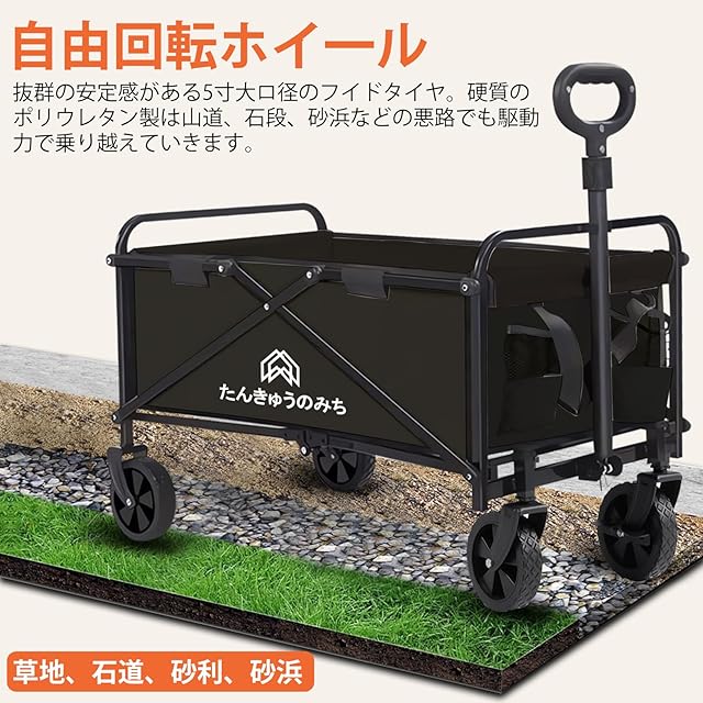 快適な移動をサポートでき:滑り止め加工の伸縮式ハンドルは角度調節が自由で、ユーザーの体格やシーンに合わせた快適さを提供。360°回転する5インチホイールを搭載し、前輪にはブレーキ装置を装備。草地・砂浜・砂利道などの複雑な地形でもスムーズに移動可能。さらに、カート前部に収納ポケットを設置し、小物をサッと出し入れできる利便性。