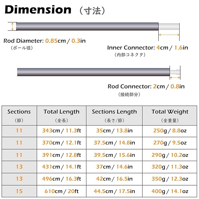 【携帯性に優れ】-- 軽いテントポールは、9-15分割してコンパクトに収納でき、持ち運びやす