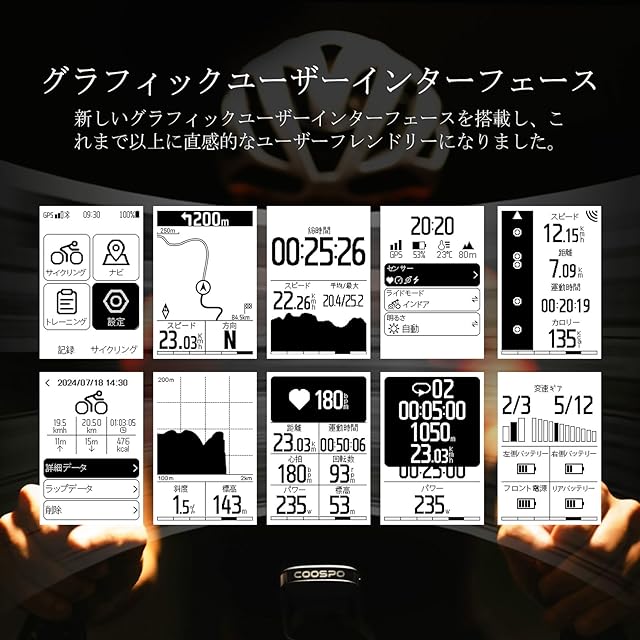 豊富なライドデータ:CS500 自転車スピードメーターは新しいグラフィックユーザーインターフェースを搭載し、これまで以上に直感的なユーザーフレンドリーになりました。1ページに最大7項目のデータを表示させ、最大9ページにより140+項目が表示可能です。更に、サイコン本体またアプリで画面を自分の好みにカスタマイズすることができます。