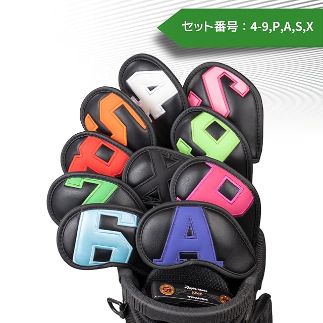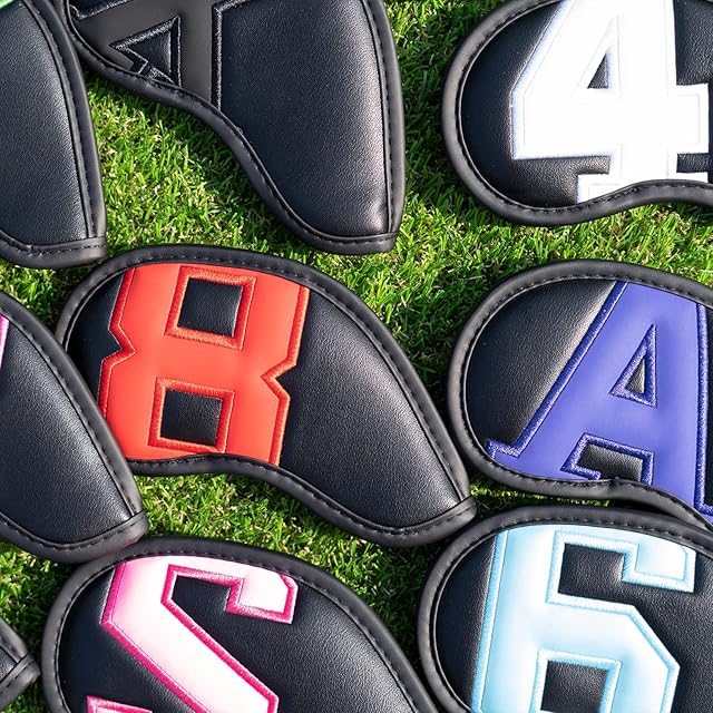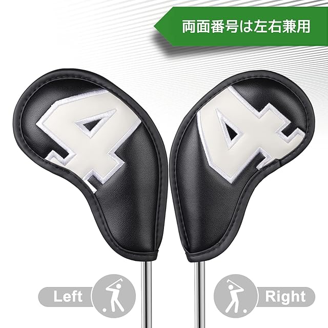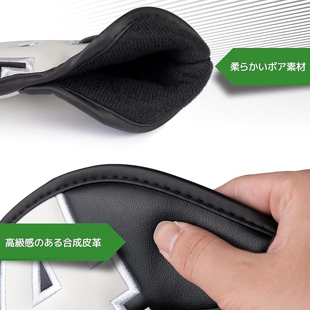【高級感のある素材】表生地は高級感のある合成皮革(PUレザー)なので、耐磨耗性、防水性があります。裏生地はポリエステル製柔らかいボア素材になっていますので、大切なクラブヘッドを傷や汚れから守ります。<br>【おしゃれな番手】番号は大きい数字なので、、一目で番号が分かります。<br>【対応】通用のアイアンカバーですので、ほどんどんのアイアンには対応しできます。<br>【マグネット開閉】磁石開閉で、出し入れやすくてラウンド中も落としにくいです。<br>【精巧な工芸】しっかりしていて縫製工芸、縫い目から裂けてくる心配がありません。番手は平縫い、高度の熟練技術を駆使して作られた、耐久性が良くて、簡単に脱落心配はありません。