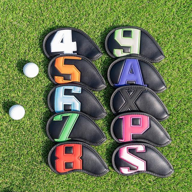 ゴルフアイアンカバー マグネット ウェッジカバー クラブヘッドカバー セット 10pcs(4-9,P,A,S,X) 両面ラフル番号 黒い合成皮革