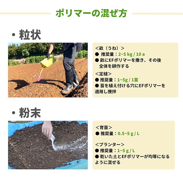 【商品について】 EFポリマーはオレンジの皮から生まれた、100%自然由来の超吸水性ポリマー(保水剤)です。 作物に最も最適な自重の50倍の水を吸水し、土壌の保水性、保肥性を向上します。また、土壌内で長く水分を保持することで作物の生長をサポートします。 EFポリマーは約6か月間、吸水・放出を繰り返し、1年で完全に生分解性するため、土壌や環境汚染につながる成分を一切残しません。微生物に分解される過程で土壌の微生物環境を活性化するとともに、吸排出を繰り返すことで土壌の団粒構造の発達を促進する効果を期待できます。 使い方はとってもシンプル。製品を土壌に混ぜ込み、根の付近に適用していただくことで、長期間水や肥料を保持することができます。 【おすすめの作物や植物】 野菜や穀類、果樹、花木、観葉植物、芝生など幅広くお使いいただけます。 【注意点】 ・推奨量を守ってご使用ください。はじめは少ない量からお試しください。 ・適用の際には灌水前の乾燥した土壌に混ぜ込んでください。