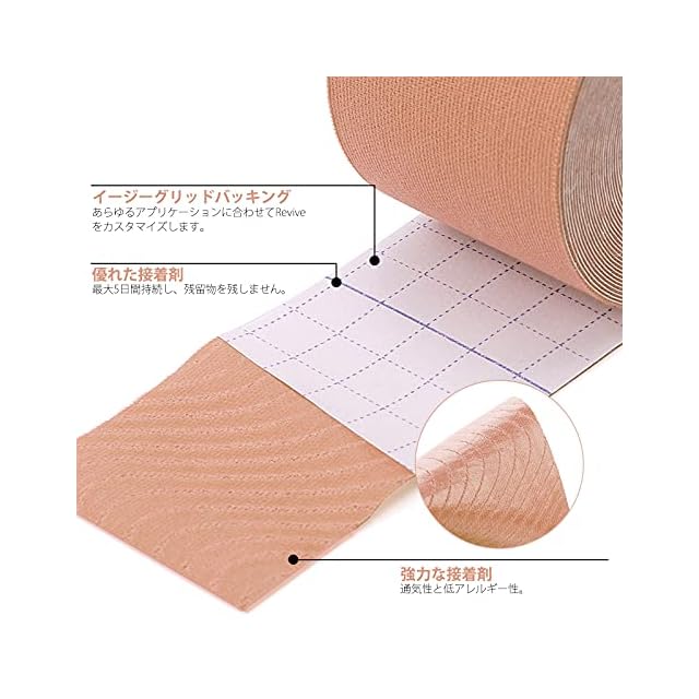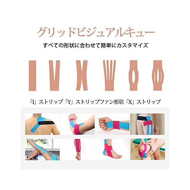 【素材】強い通気性を持っています。厚みがあり、しっかり固定できる綿布素材に改良しました。表面に小さな穴があり、通気性に富んでいます。綿の素材で肌に刺激を与えません。<br> 【耐久性と耐水性】 粘着力強,特に剥がれにくく耐久性、耐水性にも優れており、 重ねて張っても、切り口からめくれていません。汗、水に強いので、貼ったままでシャワーや泳ぎなど大丈夫です。<br> 【伸縮性良く】筋肉に沿って貼ると、テープの伸縮性によって筋肉の動きをサポートし、血液の循環を促します。<br> 【キネシオロジーテープ】キネシオロジーテープ は弾性テーピングテープです。キネシオロジーテープ業務用は筋肉に沿って皮膚に直接付着し、筋肉、関節、靭帯、腱をサポートします,過度の筋肉のストレッチを防ぐことで怪我を防ぎます。 定期的に運動する方や職業病で特定の地域を応援したい方におすすめ。<br> 【応用】該当部品:2.5cmテーピング-指/手/首/肘/肩。5cmテーピング-手首/ふくらはぎ/膝/太もも/ウエスト。<br>