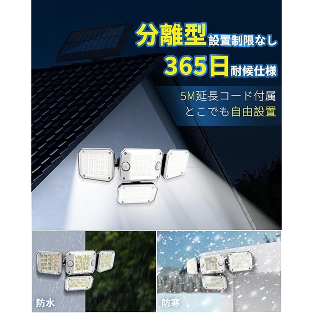 【分離型デザイン&設置制限なし】5m防水延長ケーブル付属でソーラーパネルとライト本体を分離設置可能。日当たりの良い場所にパネルを設置しつつ、ライトは玄関やガレージなど日陰エリアに自由に設置できる柔軟性を実現。延長コードの長さを活かした多様な配置が可能。付属の固定金具で簡単施工でき、建物構造や地形に左右されないユニバーサル設計です。