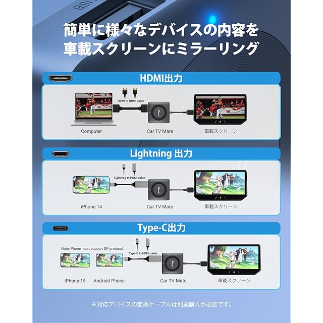 【かんたんセットアップ】①本体を車のUSBポートに接続②TV stickなどのHDMI デバイスを本体に接続 ③HDMIデバイスは別途で電源を供給する必要があります。④本製品を接続した後、ホーム画面で「HDMI」をタップし、HDMIデバイスを本製品のHDMIポートに接続してください。お使いのスマートフォンのホットスポット機能を利用して、Fire TV Stickなどのコンテンツにインターネット接続を共有することで、車内でHDMI入力映像を視聴できます。また、車載Wi-Fiを使用することも可能です。※本製品はスマートフォンのテザリング機能を直接使用することはできませんので、ご了承ください。