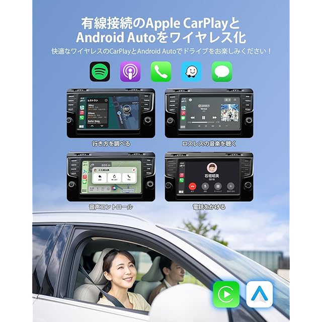 【手を解放して運転に集中】OTTOCAST Car TV Mate Maxは、ワイヤレスCarPlayおよびAndroid Auto機能を搭載しており、運転中の電話、メッセージ、音楽、地図、ポッドキャスト再生など、すべての有線CarPlayおよびAndroid Auto機能をワイヤレスに変換するアダプターです。Car TV Mate Maxを利用することで、道案内や通話、メッセージの送受信、お気に入りの音楽を自由に楽しむことができます。